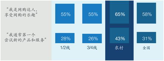 农村用户中的“网络达人”更是比一线及二线城市多出25%,渴望第一个尝试新的产品和服务。